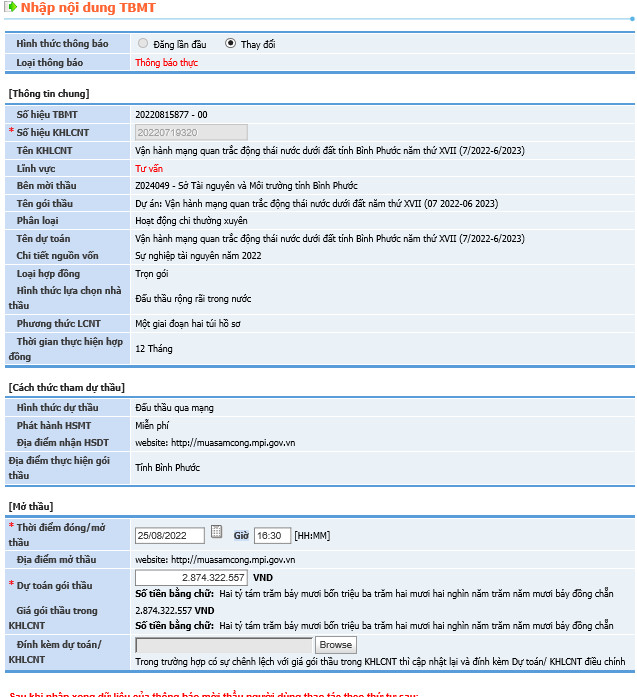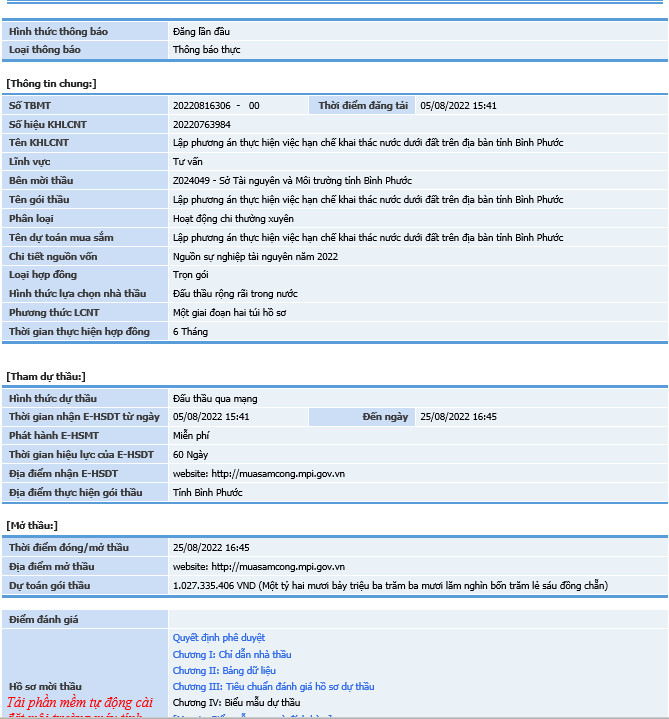 Phê duyệt HS mời thầu gói thầu: Vận hành mạng quan trắc động thái nước dưới đất tỉnh BP năm thứ XVII( 7/2022- 6/2023) thuộc DA vận hành mạng quan trắc động thái nước dưới đất |